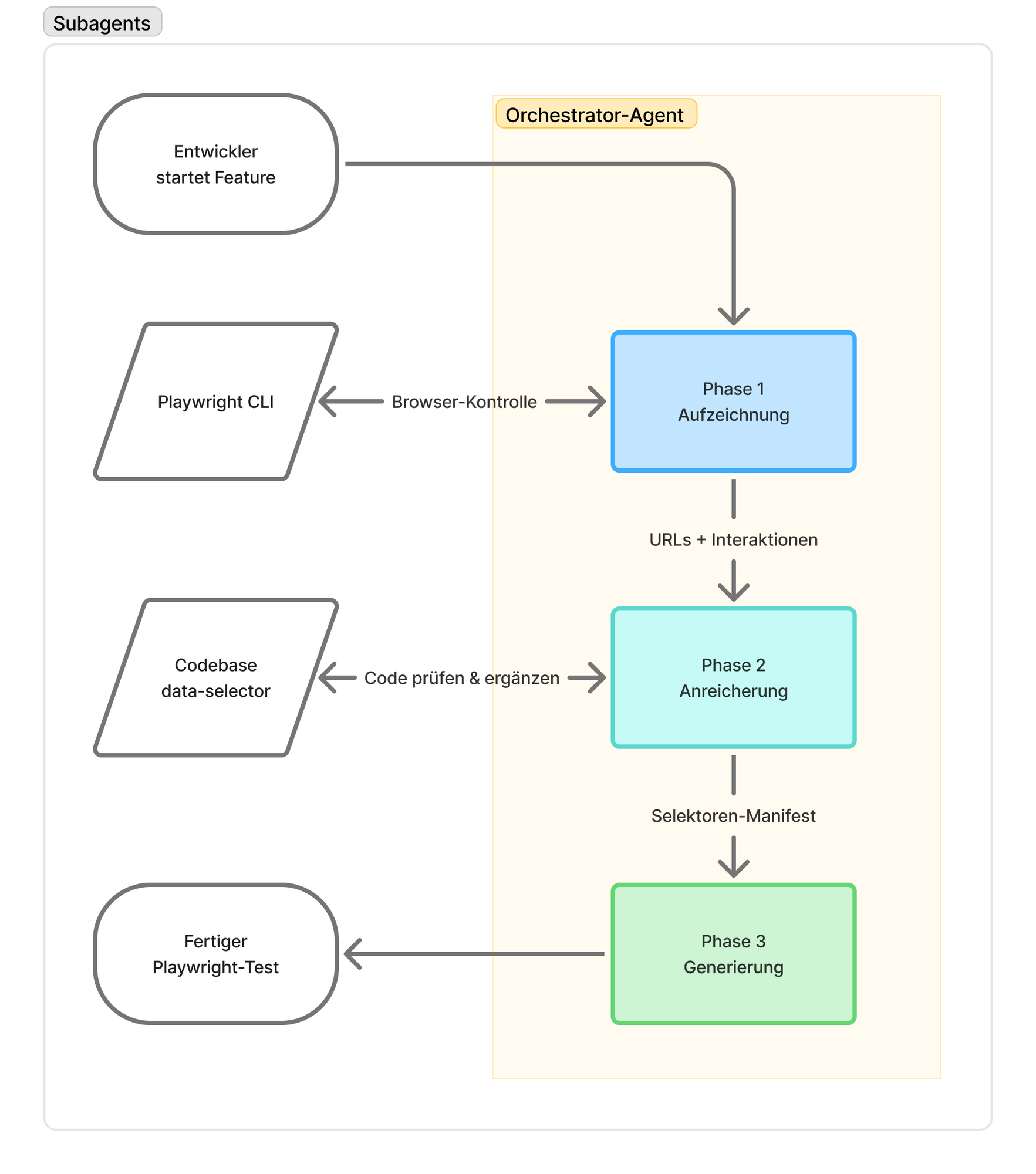 Wir haben dafür einen eigenen Orchestrator-Agenten geschrieben, der automatisch Playwright E2E-Tests generiert, indem er drei Phasen koordiniert: