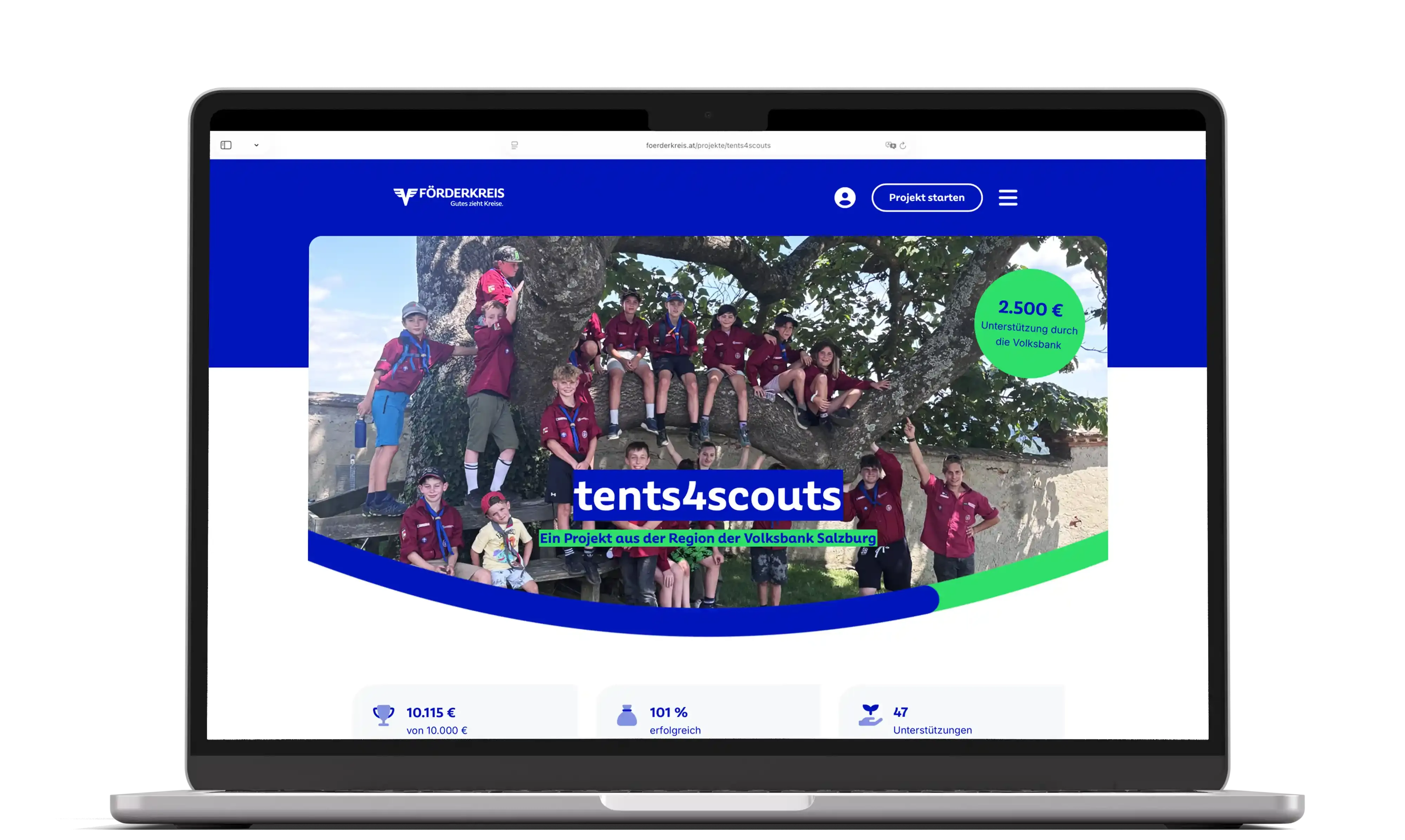 Das erste Projekt der Plattform, „tents4scouts" der Pfadfindergruppe Thalgau, erreichte sein Fundingziel von 10.000 €. Mit 10.115 € von 47 Unterstützerinnen und Unterstützern – darunter 2.500 € als direktes Co-Funding der Volksbank Salzburg – kann die Pfadfindergruppe ihre geplanten Camping-Abenteuer verwirklichen.