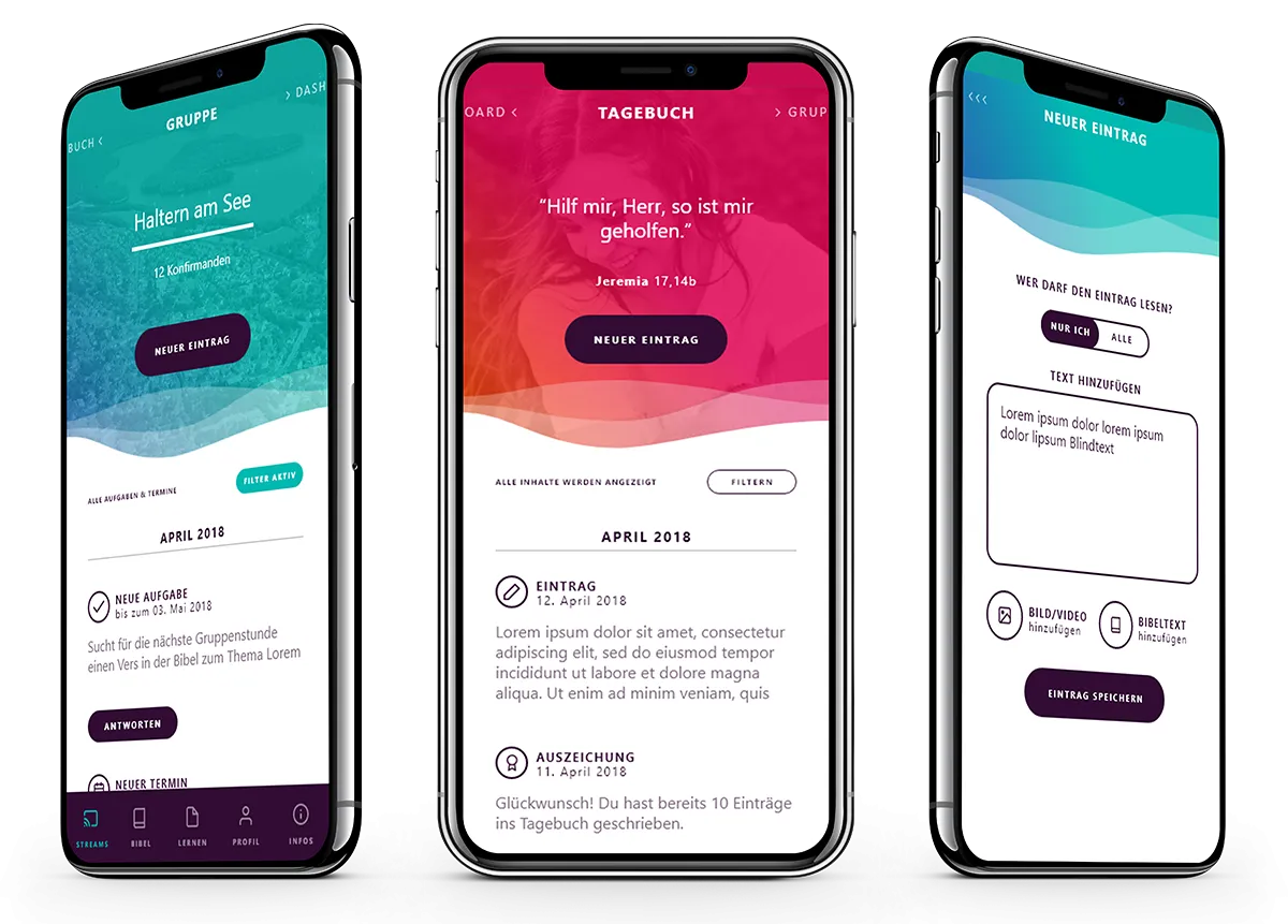 Für Gemeinden soll die Konfirmanden- und Jugendarbeit erleichtert werden. Dies schließt neben der Gruppenorganisation und Kommunikation auch die inhaltliche Arbeit ein: Sowohl bibeldidaktische Inhalte und Materialien sollen zugänglich gemacht werden, als auch Inhalte mit curricularer Relevanz und lebenswirklichem Bezug. Um die Zielgruppe von 13-/14-Jährigen anzusprechen, kommt eine App als zeitgemäßes Medium infrage. Smartphones sind ständige Begleiter und vereinfachen die Vernetzung und Kommunikation.